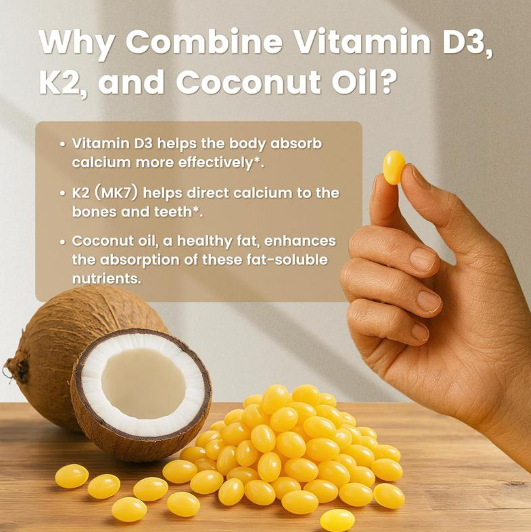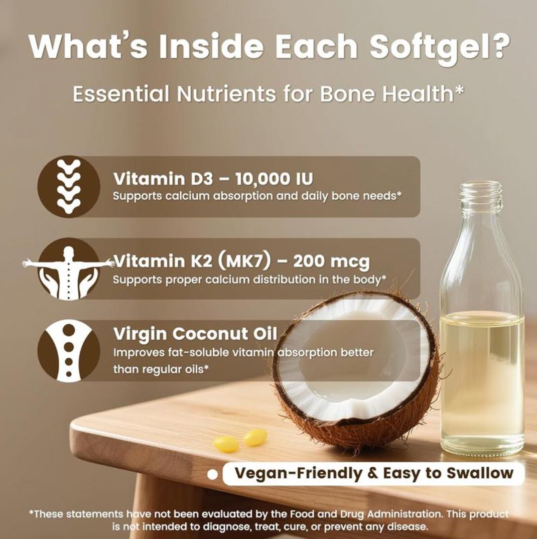Our Vitamin D3 10,000 IU + K2 200 mcg softgel is expertly formulated for maximum synergy. By enhancing each other’s effectiveness, these two essential nutrients deliver superior results for mood, bone strength, heart health, and immunity—all in one convenient, easy-to-swallow capsule.